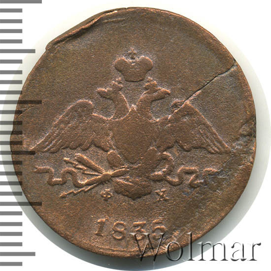Аверс монеты 1 копейка 1835 года ЕМ-ФХ