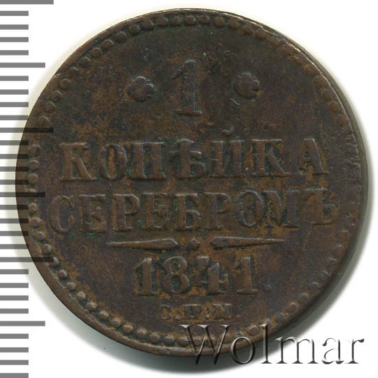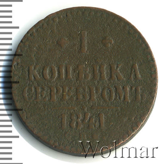 В центре надпись в две строки: «КОПѢЙКА»│«СЕРЕБРОМЪ». Над надписью обозначение номинала — цифра «1», ограниченная с обеих сторон цветочными розетками. Под надписью расположен декоративный разделитель в виде двух фигурных линий и небольшим прямоугольным ромбом между ними. Под разделителем — год выпуска монеты «1841.». Ниже, обозначение монетного двора — буквы «С.П.М.». По окружности канта имеются рельефные элементы, выполненные в виде точек.