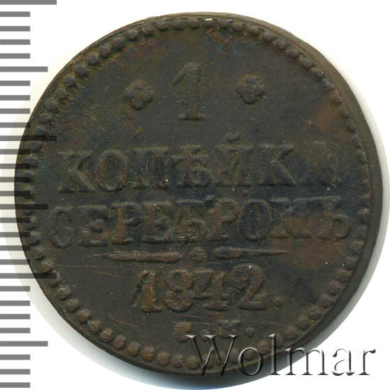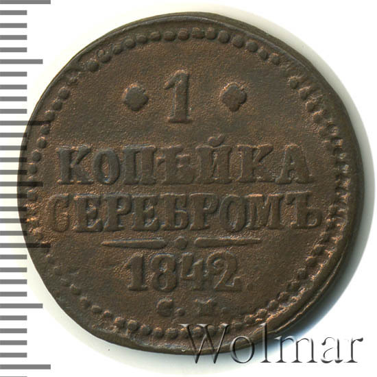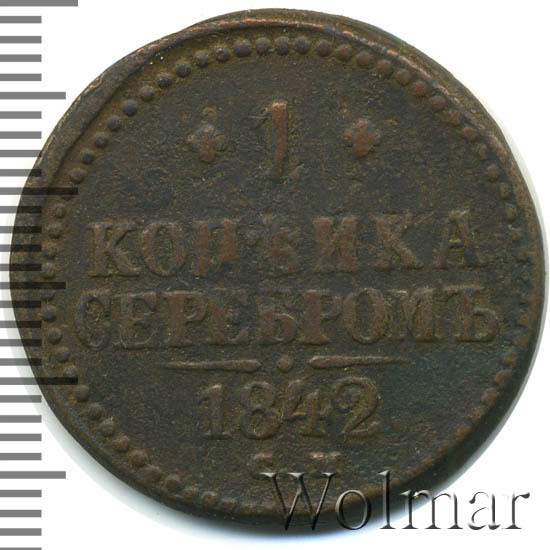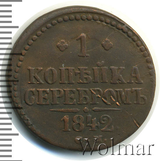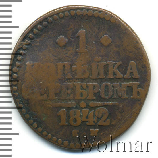 В центре надпись в две строки: «КОПѢЙКА»│«СЕРЕБРОМЪ». Над надписью обозначение номинала — цифра «1», ограниченная с обеих сторон цветочными розетками. Под надписью расположен декоративный разделитель в виде двух фигурных линий и небольшим прямоугольным ромбом между ними. Под разделителем — год выпуска монеты «1842.». Ниже, обозначение монетного двора — буквы «С.М.». По окружности канта имеются рельефные элементы, выполненные в виде точек.
