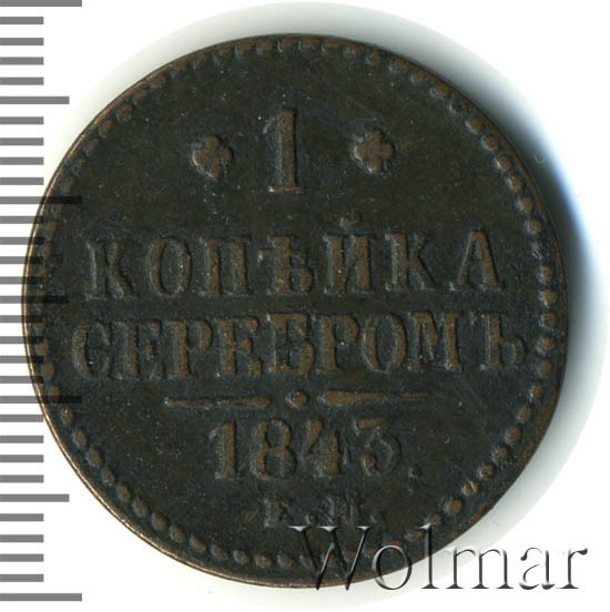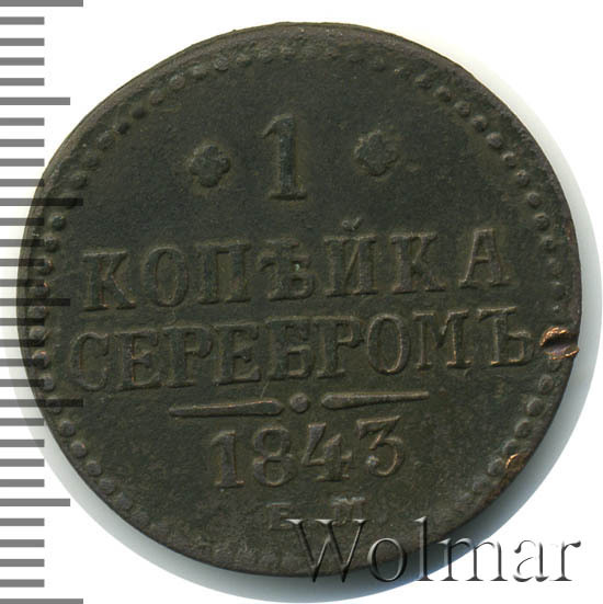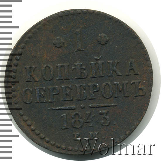 В центре надпись в две строки: «КОПѢЙКА»│«СЕРЕБРОМЪ». Над надписью обозначение номинала — цифра «1», ограниченная с обеих сторон цветочными розетками. Под надписью расположен декоративный разделитель в виде двух фигурных линий и небольшим прямоугольным ромбом между ними. Под разделителем — год выпуска монеты «1843.». Ниже, обозначение монетного двора — буквы «Е.М.». По окружности канта имеются рельефные элементы, выполненные в виде точек.