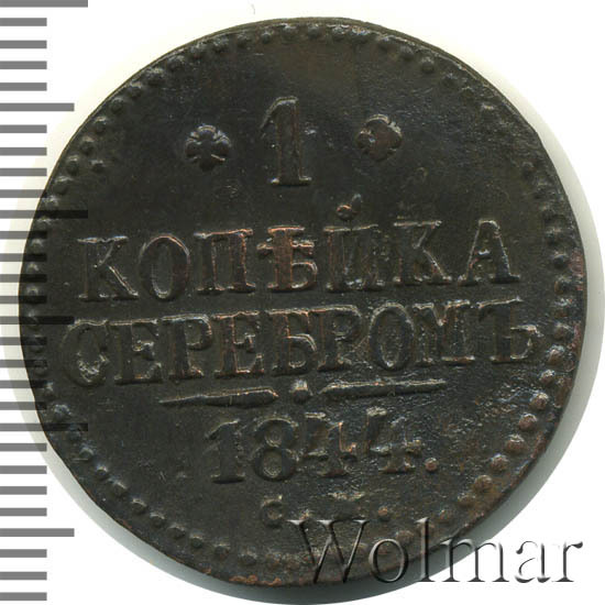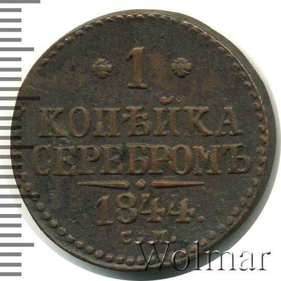 В центре надпись в две строки: «КОПѢЙКА»│«СЕРЕБРОМЪ». Над надписью обозначение номинала — цифра «1», ограниченная с обеих сторон цветочными розетками. Под надписью расположен декоративный разделитель в виде двух фигурных линий и небольшой точки между ними. Под разделителем — год выпуска монеты «1844.». Ниже, обозначение монетного двора — буквы «С.М.». По окружности канта имеются рельефные элементы, выполненные в виде точек.