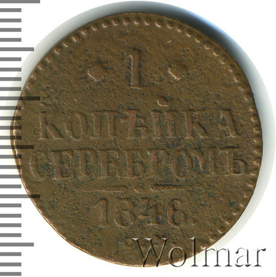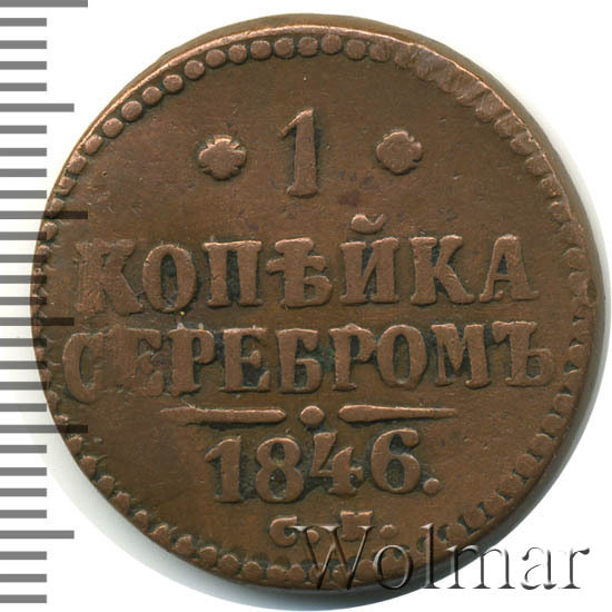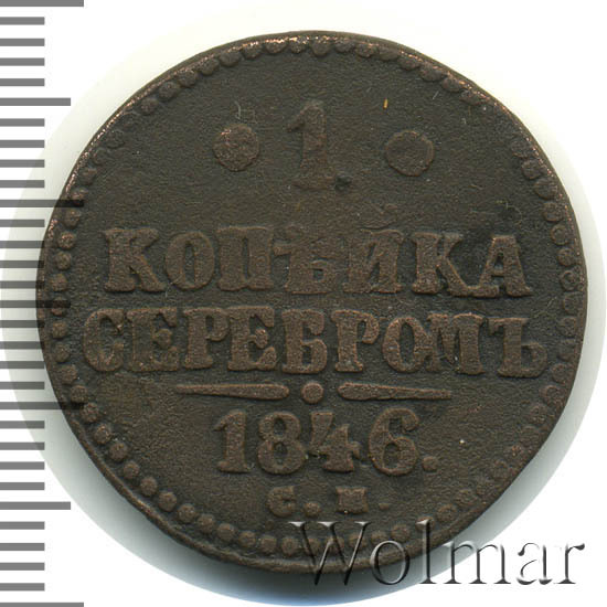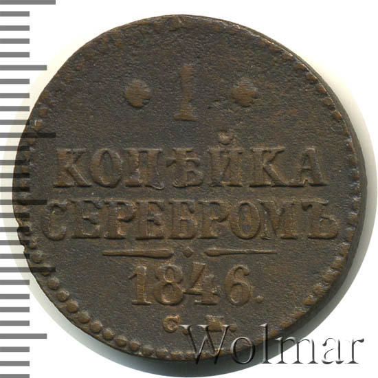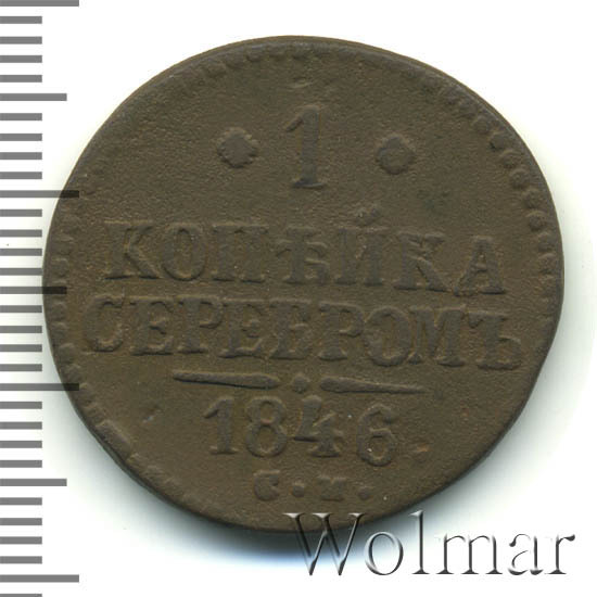 В центре надпись в две строки: «КОПѢЙКА»│«СЕРЕБРОМЪ». Над надписью обозначение номинала — цифра «1», ограниченная с обеих сторон цветочными розетками. Под надписью расположен декоративный разделитель в виде двух фигурных линий и небольшой точки между ними. Под разделителем — год выпуска монеты «1846.». Ниже, обозначение монетного двора — буквы «С.М.». По окружности канта имеются рельефные элементы, выполненные в виде точек.