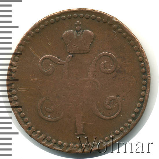 В центре вензель Николая I. Над ним Корона Российской империи. По окружности канта имеются рельефные элементы, выполненные в виде точек.