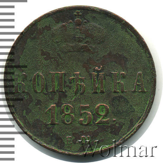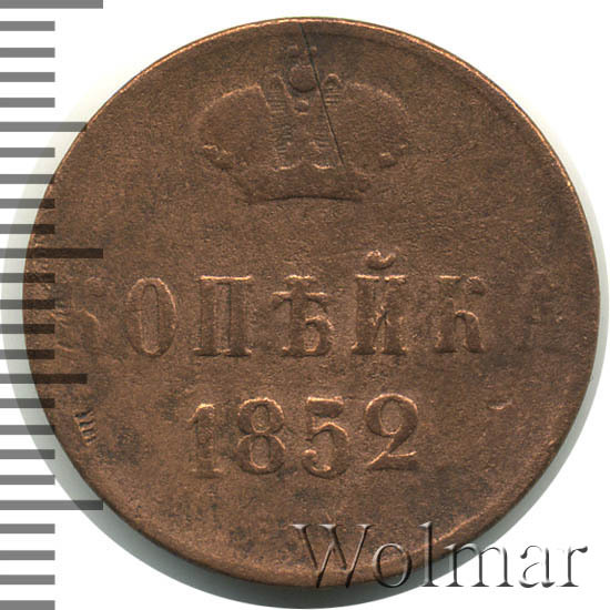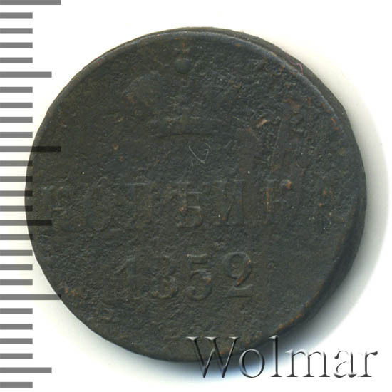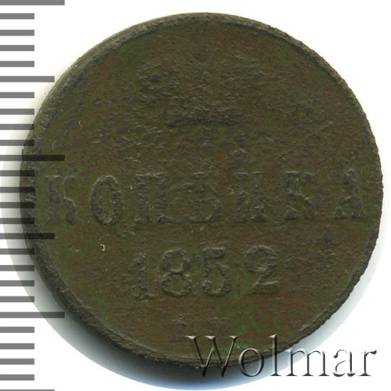 В центе обозначение номинала — слово «КОПЕЙКА». Выше номинала - Корона Российской империи. Ниже номинала — год выпуска монеты «1852.» и под годом - обозначение монетного двора буквы «Е.М.».