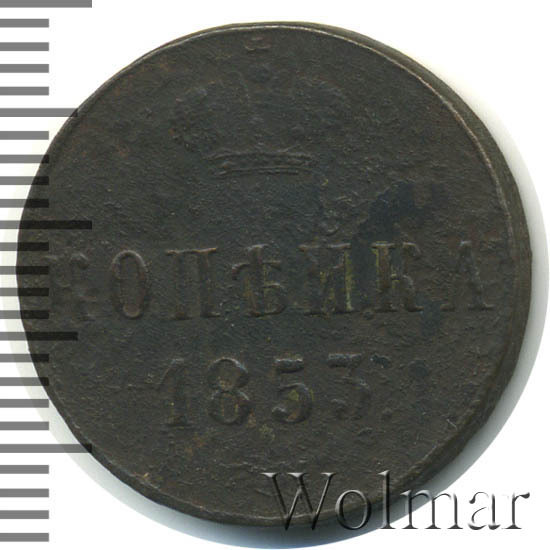 В центе обозначение номинала — слово «КОПЕЙКА». Выше номинала - Корона Российской империи. Ниже номинала — год выпуска монеты «1853.» и под годом - обозначение монетного двора буквы «Е.М.».