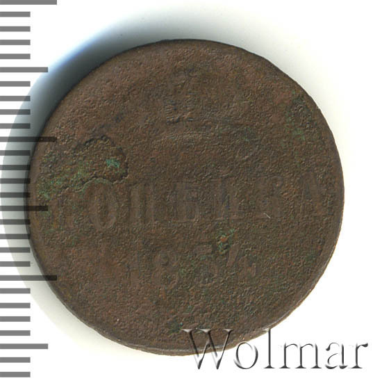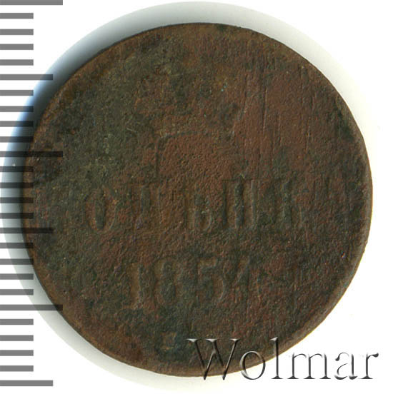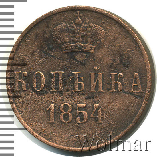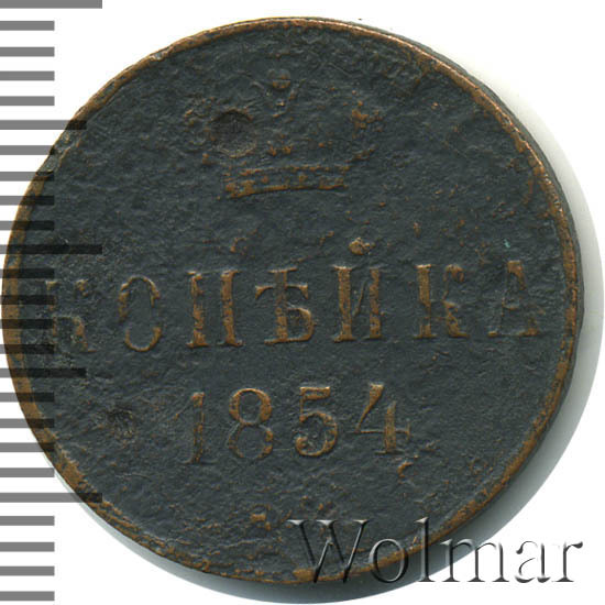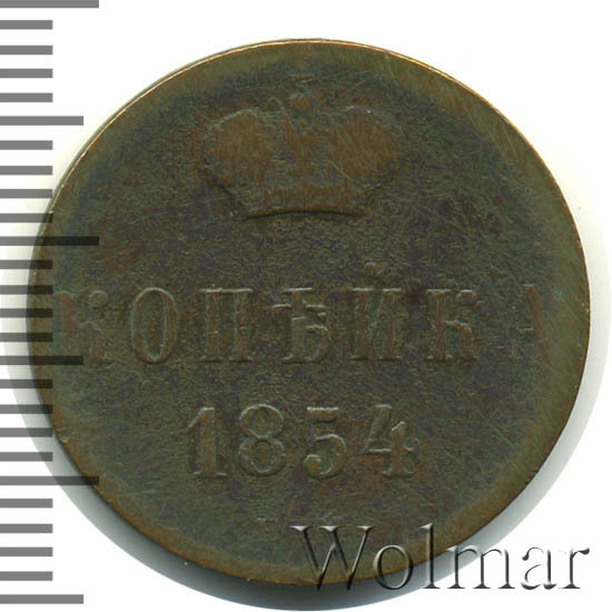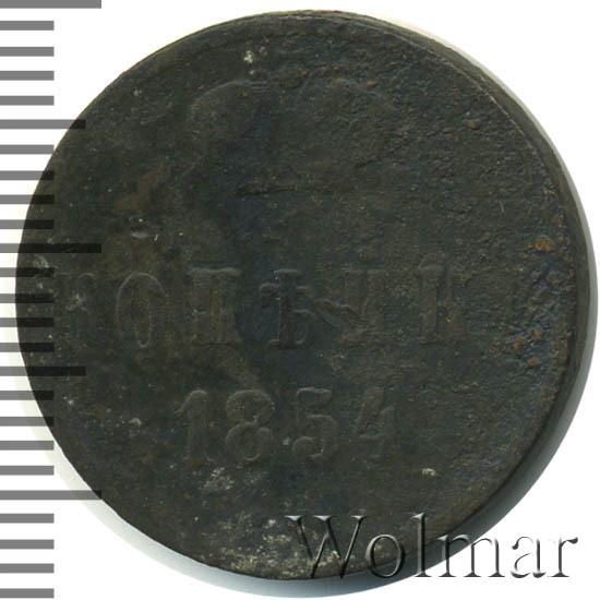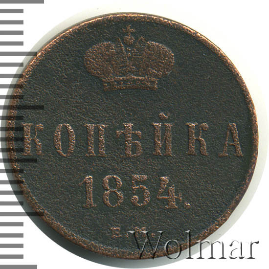 В центе обозначение номинала — слово «КОПЕЙКА». Выше номинала - Корона Российской империи. Ниже номинала — год выпуска монеты «1854.» и под годом - обозначение монетного двора буквы «Е.М.».