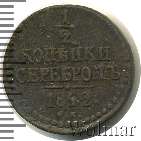 В центре надпись в две строки: «КОПѢЙКИ»│«СЕРЕБРОМЪ». Над надписью обозначение номинала — цифра «1/2». Под надписью расположен декоративный разделитель в виде двух фигурных линий и небольшим прямоугольным ромбом между ними. Под разделителем — год выпуска монеты «1842.». Ниже, обозначение монетного двора — буквы «С.М.». По окружности канта имеются рельефные элементы, выполненные в виде точек.