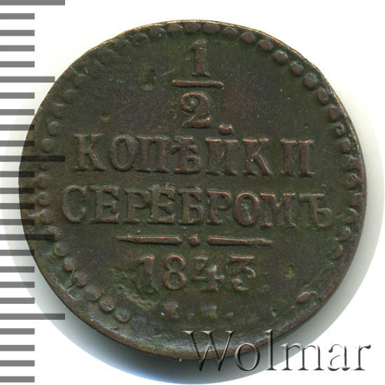 Аверс монеты 1/2 копейки 1843 года ЕМ