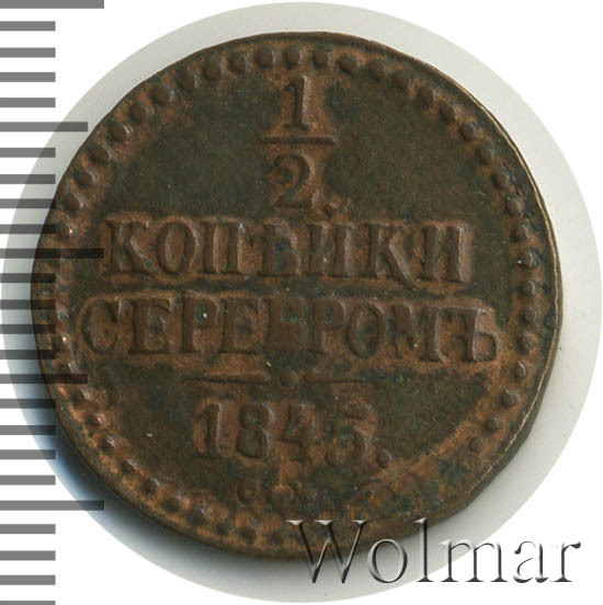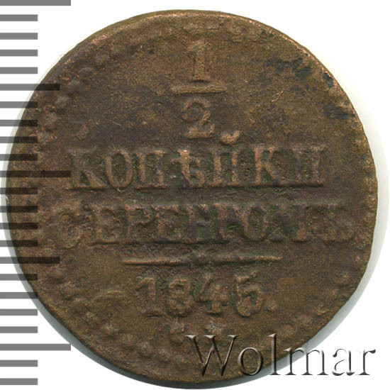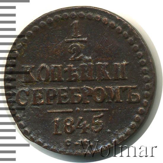 В центре надпись в две строки: «КОПѢЙКИ»│«СЕРЕБРОМЪ». Над надписью обозначение номинала — цифра «1/2». Под надписью расположен декоративный разделитель в виде двух фигурных линий и небольшим прямоугольным ромбом между ними. Под разделителем — год выпуска монеты «1845.». Ниже, обозначение монетного двора — буквы «С.М.». По окружности канта имеются рельефные элементы, выполненные в виде точек.