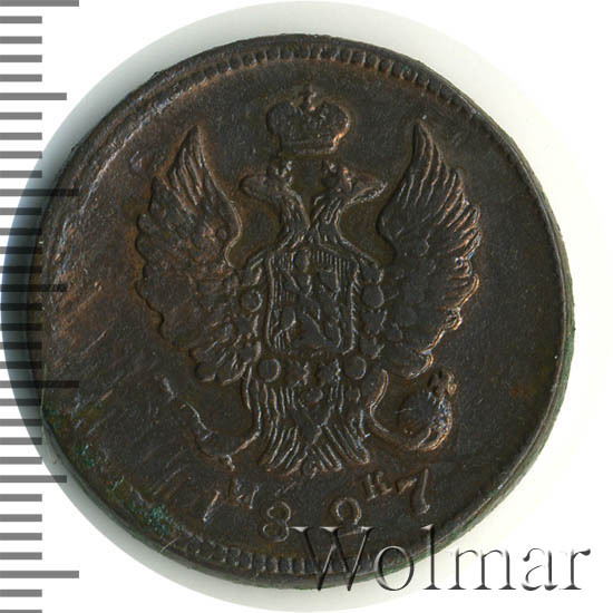 Аверс монеты 2 копейки 1827 года ЕМ-ИК