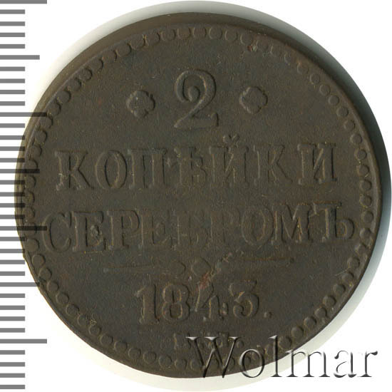 В центре надпись в две строки: «КОПѢЙКИ»│«СЕРЕБРОМЪ». Над надписью обозначение номинала — цифра «2», ограниченная с обеих сторон цветочными розетками. Под надписью расположен декоративный разделитель в виде двух фигурных линий и небольшим прямоугольным ромбом между ними. Под разделителем — год выпуска монеты «1843.». Ниже, обозначение монетного двора — буквы «Е.М.». По окружности канта имеются рельефные элементы, выполненные в виде точек.