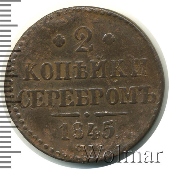 В центре надпись в две строки: «КОПѢЙКИ»│«СЕРЕБРОМЪ». Над надписью обозначение номинала — цифра «2», ограниченная с обеих сторон цветочными розетками. Под надписью расположен декоративный разделитель в виде двух фигурных линий и небольшим прямоугольным ромбом между ними. Под разделителем — год выпуска монеты «1845.». Ниже, обозначение монетного двора — буквы «С.М.». По окружности канта имеются рельефные элементы, выполненные в виде точек.