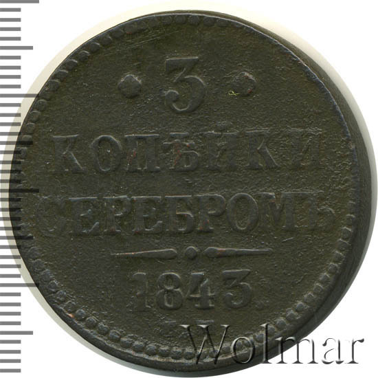 В центре надпись в две строки: «КОПѢЙКИ»│«СЕРЕБРОМЪ». Над надписью обозначение номинала — цифра «3», ограниченная с обеих сторон цветочными розетками. Под надписью расположен декоративный разделитель в виде двух фигурных линий и небольшой точки между ними. Под разделителем — год выпуска монеты «1843.». Ниже, обозначение монетного двора — буквы «Е.М.». По окружности канта имеются рельефные элементы, выполненные в виде точек.