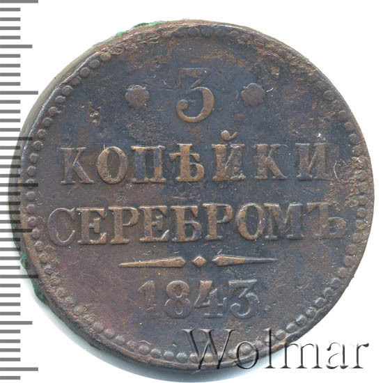 В центре надпись в две строки: «КОПѢЙКИ»│«СЕРЕБРОМЪ». Над надписью обозначение номинала — цифра «3», ограниченная с обеих сторон цветочными розетками. Под надписью расположен декоративный разделитель в виде двух фигурных линий и небольшой точки между ними. Под разделителем — год выпуска монеты «1843.». Ниже, обозначение монетного двора — буквы «С.П.М.». По окружности канта имеются рельефные элементы, выполненные в виде точек.