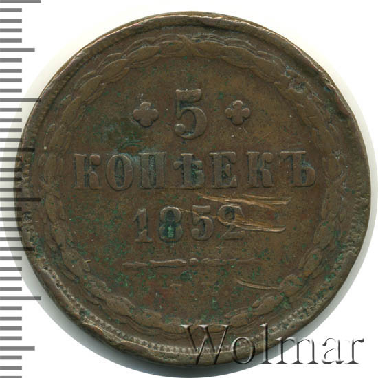 В центре указан номинал «5», ограниченный с обеих сторон цветочными розетками. Под цифрой номинала — слово "КОПЕЕК", под ним год выпуска монеты «1852.». Ниже, расположен декоративный разделитель в виде двух фигурных линий и небольшой точки между ними. Под разделителем обозначение монетного двора «Е.М.».