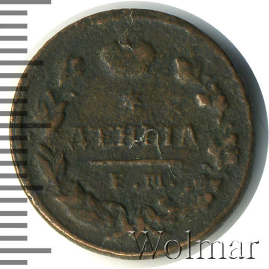 В центре указан номинал - надпись «ДЕНЬГА». Над обозначением номинала - шестиконечная звезда. Над ней - императорская корона. Под надписью - прямая черта, под ней - обозначение монетного двора «Е.М.». Вдоль канта, не доходя до короны, изображен венок из лавровой и дубовой ветви, которые в нижней части переплетены лентой. По окружности канта имеются рельефные элементы, выполненные в виде точек.