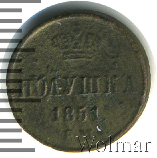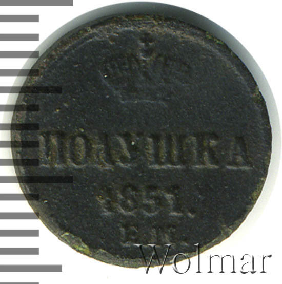 В центе обозначение номинала — слово «ПОЛУШКА». Выше номинала - Корона Российской империи. Ниже номинала — год выпуска монеты «1851.», под годом — обозначение монетного двора буквы «Е.М.».
