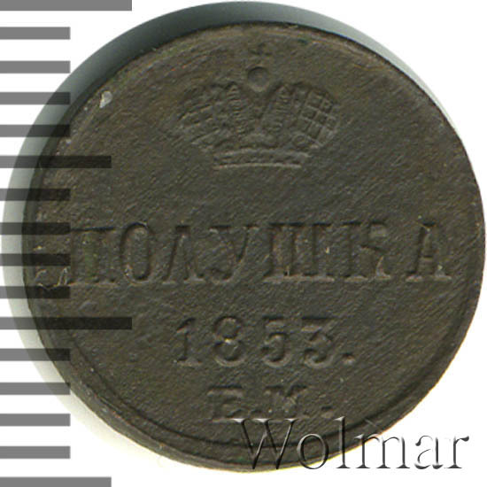 В центе обозначение номинала — слово «ПОЛУШКА». Выше номинала - Корона Российской империи. Ниже номинала — год выпуска монеты «1853.», под годом — обозначение монетного двора буквы «Е.М.».