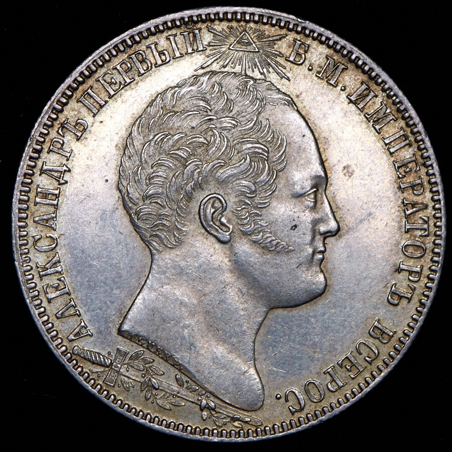 В центре профильный портрет вправо императора Александра I. В обрезе шеи инициалы медальера «H. GUBE F. » - А. И. Губе. Над головой императора - "всевидящее око" в лучах. Под портретом - меч, увитый лавровой ветвью. Слева от портрета, вдоль канта, надпись: «АЛЕКСАНДРЪ ПЕРВЫЙ», справа - «Б. М. ИМПЕРАТОРЪ ВСЕРОС.». По окружности канта имеются рельефные элементы, выполненные в виде зубцов.