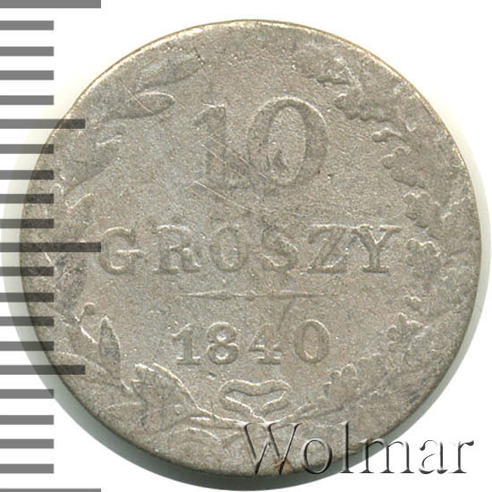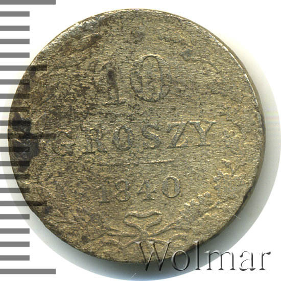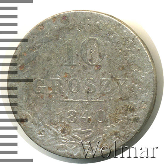 В центре - надпись: «GROSZY». Над надписью - цифра номинала «10». Под надписью расположен декоративный разделитель в виде двух фигурных черт и небольшой точки между ними. Под разделителем - дата выпуска «1840». Вдоль канта изображен венок из лавровой и дубовой ветви, которые в нижней части перевязаны лентой на узел бантом.