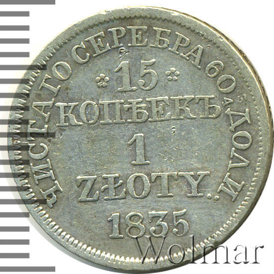 В центре надпись в четыре строки: «15»│«КОПѢЕКЪ»│«1»│«ZLOTY.». Цифра «15» ограниченна с обеих сторон цветочными розетками. Под надписью дата выпуска — «1835». Вдоль канта надпись: «ЧИСТАГО СЕРЕБРА 60 3/4 ДОЛИ.». По окружности канта имеются рельефные элементы, выполненные в виде зубцов.