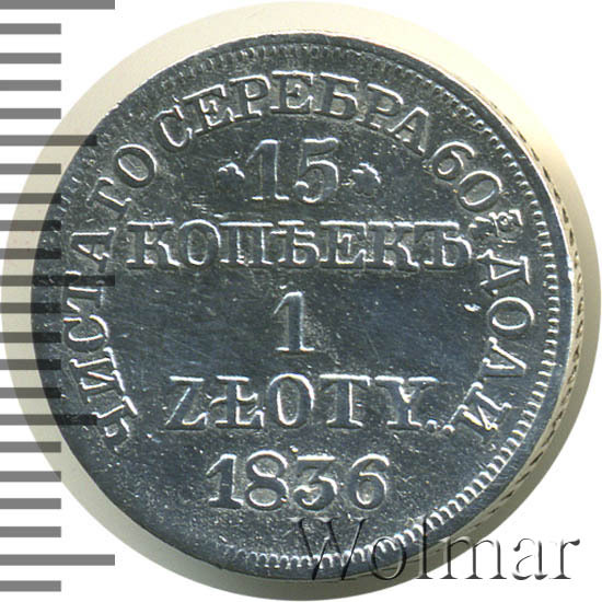 В центре надпись в четыре строки: «15»│«КОПѢЕКЪ»│«1»│«ZLOTY.». Цифра «15» ограниченна с обеих сторон цветочными розетками. Под надписью дата выпуска — «1836». Вдоль канта надпись: «ЧИСТАГО СЕРЕБРА 60 3/4 ДОЛИ.». По окружности канта имеются рельефные элементы, выполненные в виде зубцов.