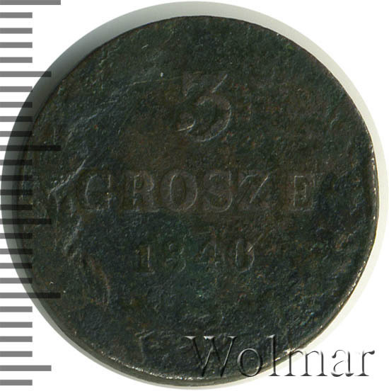 В центре - надпись: «GROSZE». Над надписью - цифра номинала «3». Под надписью - дата выпуска «1840». Вдоль канта изображен венок из лавровой и дубовой ветви, которые в нижней части перевязаны лентой на узел бантом.