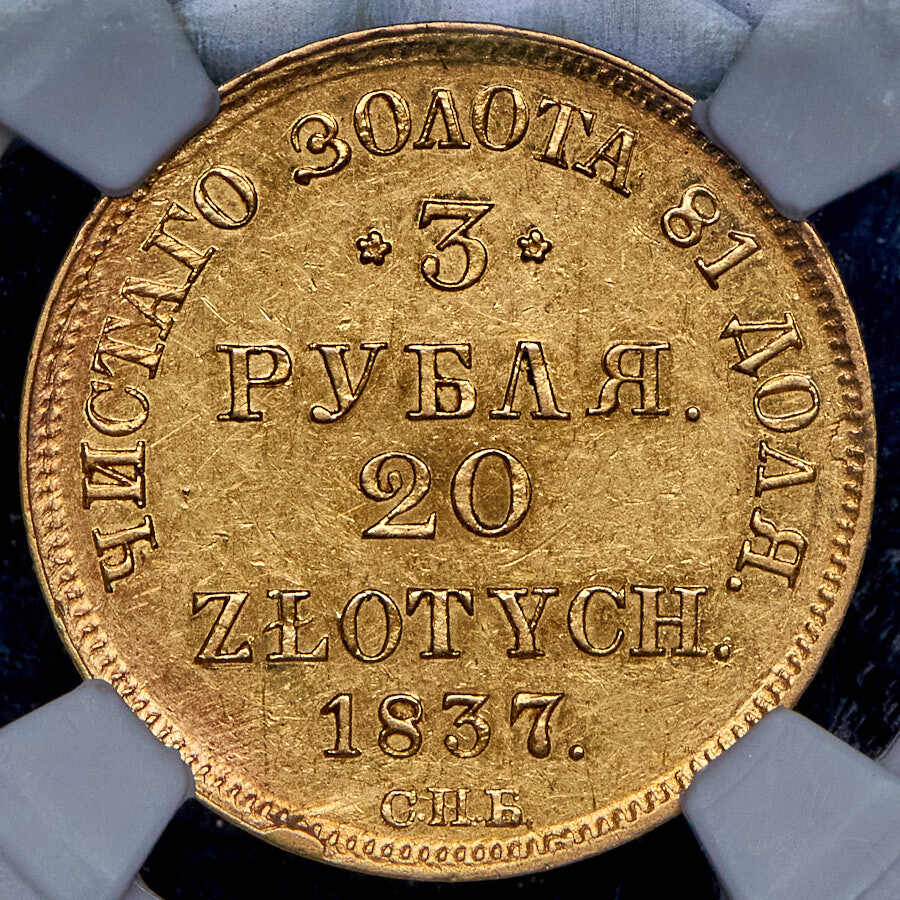 В центре надпись в четыре строки: «3»│«РУБЛЯ.»│«20»│«ZLOTYCH.». Цифра «3» ограниченна с обеих сторон цветочными розетками. Под надписью дата выпуска — «1837.» Под датой — буквы «С.П.Б.», обозначение Санкт-Петербургского монетного двора. В верхней части, вдоль канта, надпись: «ЧИСТАГО ЗОЛОТА 81 ДОЛЯ.». По окружности канта имеются рельефные элементы, выполненные в виде зубцов.
