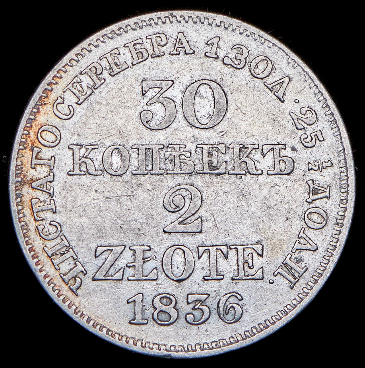 Цена на монету 30 копеек - 2 злотых 1836 года MW на сегодня, 20 февраля 2026 года