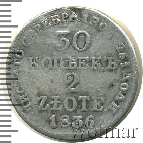 Цена на монету 30 копеек - 2 злотых 1836 года MW на сегодня, 3 ноября 2025 года