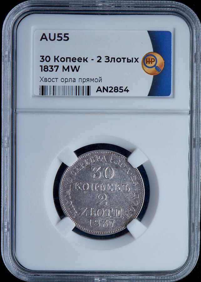 30 копеек - 2 злотых 1837 (в слабе)буквы MW Аукцион: AdaCoins Online Состояние: AU 55 | 20.11.2025 |