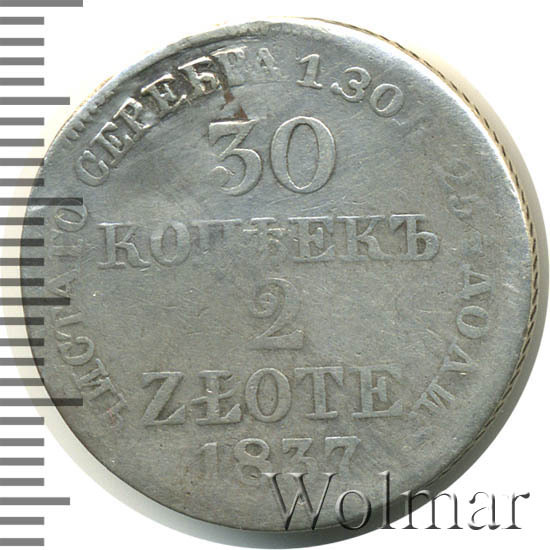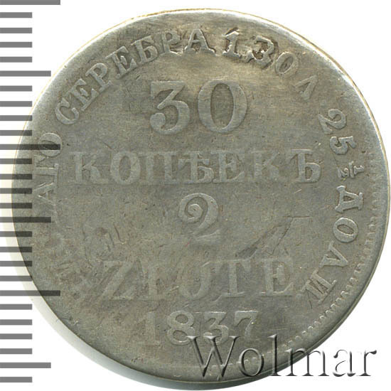 В центре надпись в четыре строки: «30»│«КОПѢЕКЪ»│«2»│«ZLOTE». Под надписью дата выпуска монеты — «1837». Вдоль канта надпись: «ЧИСТАГО СЕРЕБРА 1 ЗОЛ•25 1/2 ДОЛИ.». По окружности канта имеются рельефные элементы, выполненные в виде зубцов.