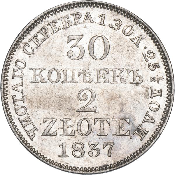 В центре надпись в четыре строки: «30»│«КОПѢЕКЪ»│«2»│«ZLOTE». Под надписью дата выпуска монеты — «1837». Вдоль канта надпись: «ЧИСТАГО СЕРЕБРА 1 ЗОЛ•25 1/2 ДОЛИ.». По окружности канта имеются рельефные элементы, выполненные в виде зубцов.