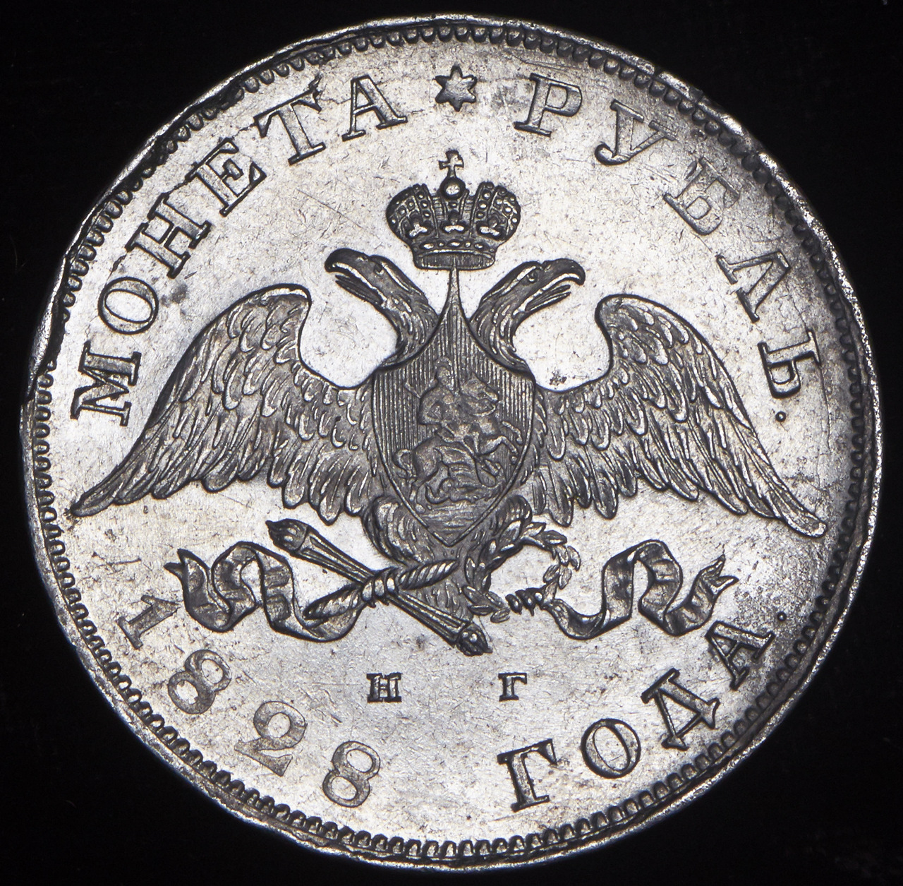 В центре изображен Государственный Герб Российской империи - двуглавый орёл с распростёртыми и опущенными вниз крыльями. На груди орла расположен Московский герб - щит с изображением Георгия Победоносца, поражающего копьем дракона. Гербовый щит, над головами орла, венчает императорская корона. Орёл держит, перевитые орденской лентой ордена Св. Апостола Андрея Первозванного, громовые стрелы и факел в правой лапе и лавровый венок — в левой. Под лентой буквы: слева «Н», справа «Г». Инициалы минцмейстера Николая Грачева. Над орлом обозначение номинала - круговая надпись «МОНЕТА РУБЛЬ.» разделённая шестиконечной звездой. Под орлом — дата выпуска монеты «1828 ГОДА.». По окружности канта имеются рельефные элементы, выполненные в виде зубцов.