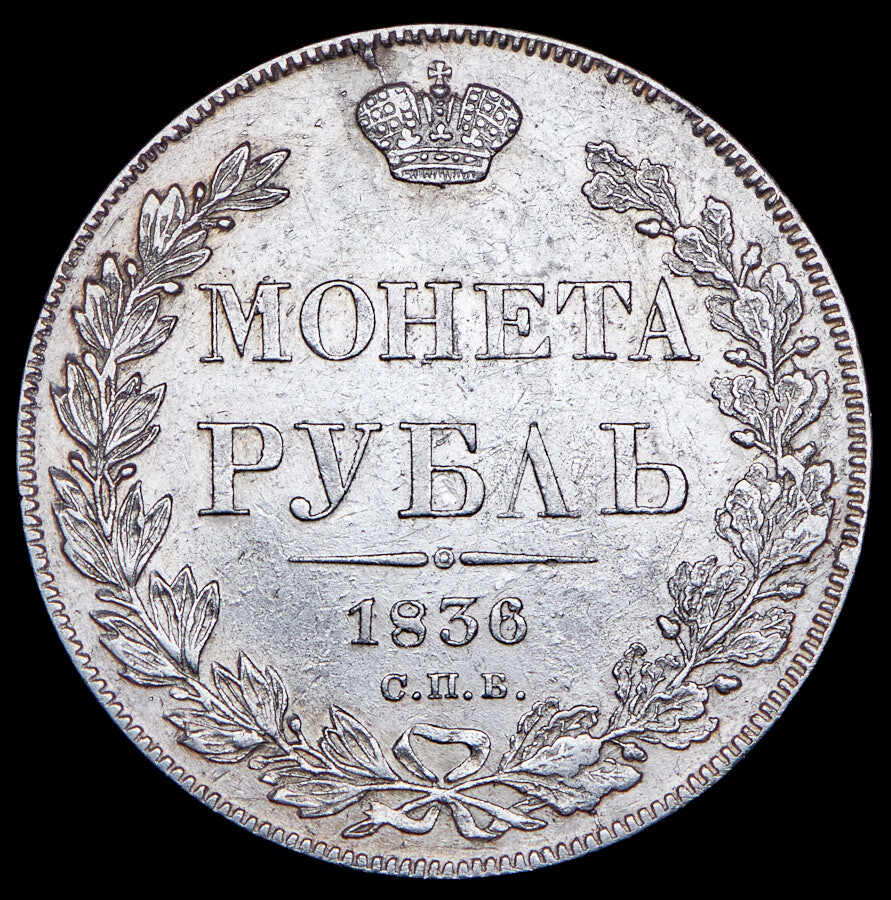 В центре указан номинал «МОНЕТА РУБЛЬ» в две строки. Над номиналом – Корона Российской империи. Под номиналом расположен декоративный разделитель в виде двух разнонаправленных фигурных линий и небольшой окружности между ними, в центре которой, выпуклая точка. Под разделителем — дата выпуска монеты «1836». Под цифрой даты — обозначение монетного двора «С.П.Б.». Вдоль канта, не доходя до короны, изображен венок из лавровой и дубовой ветви, которые в нижней части перевязаны лентой на узел бантом. По окружности канта имеются рельефные элементы, выполненные в виде зубцов.