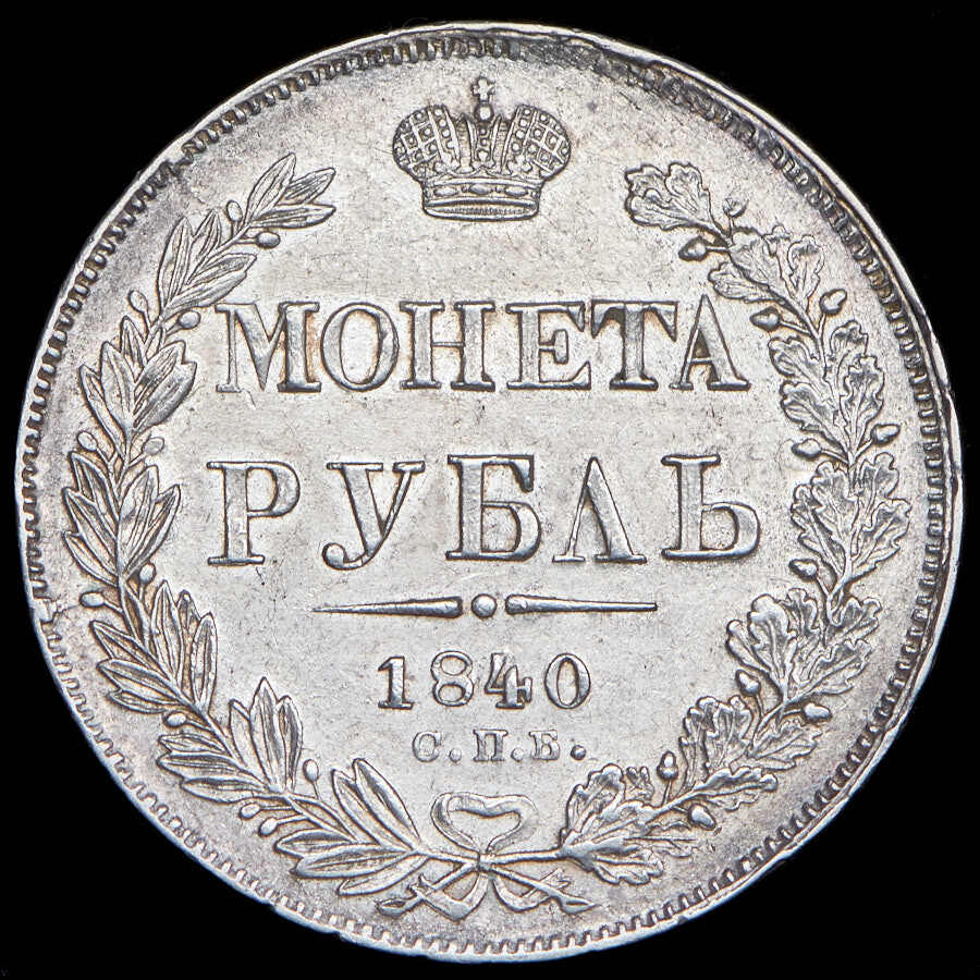 В центре указан номинал «МОНЕТА РУБЛЬ» в две строки. Над номиналом – Корона Российской империи. Под номиналом расположен декоративный разделитель в виде двух разнонаправленных фигурных линий и небольшой окружности между ними, в центре которой, выпуклая точка. Под разделителем — дата выпуска монеты «1840». Под цифрой даты — обозначение монетного двора «С.П.Б.». Вдоль канта, не доходя до короны, изображен венок из лавровой и дубовой ветви, которые в нижней части перевязаны лентой на узел бантом. По окружности канта имеются рельефные элементы, выполненные в виде зубцов.