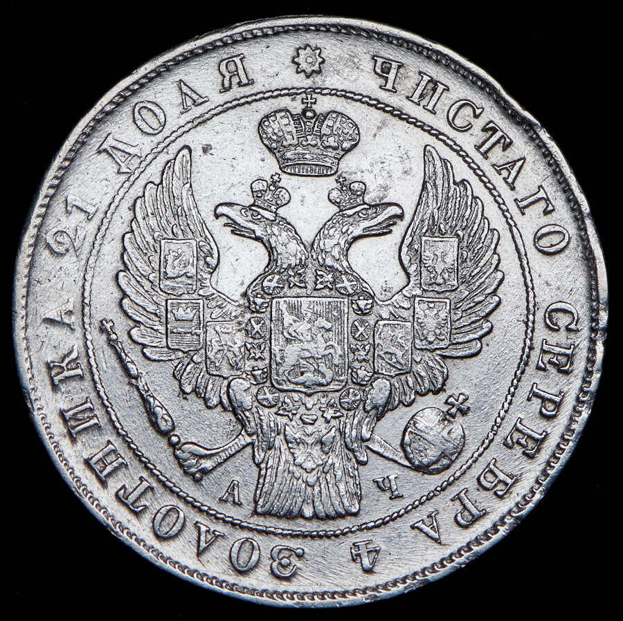 Аверс монеты 1 рубль 1842 года СПБ-АЧ орёл 1838, 8 звеньев