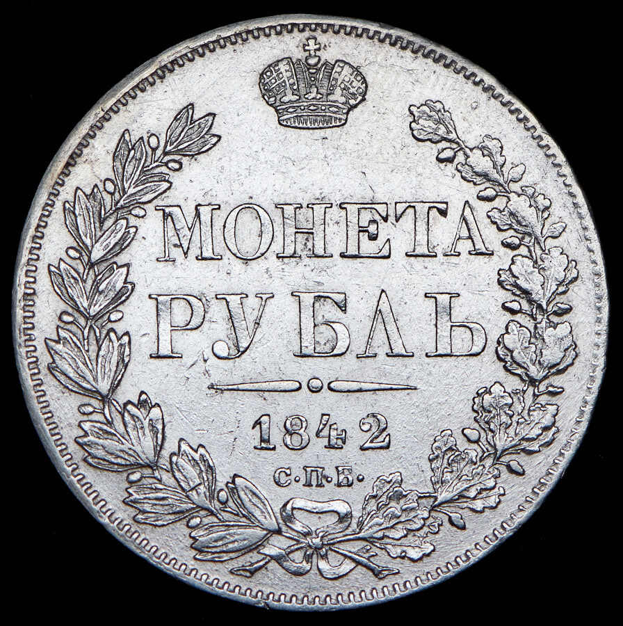 В центре указан номинал «МОНЕТА РУБЛЬ» в две строки. Над номиналом – Корона Российской империи. Под номиналом расположен декоративный разделитель в виде двух разнонаправленных фигурных линий и небольшой окружности между ними, в центре которой, выпуклая точка. Под разделителем — дата выпуска монеты «1842». Под цифрой даты — обозначение монетного двора «С.П.Б.». Вдоль канта, не доходя до короны, изображен венок из лавровой и дубовой ветви, которые в нижней части перевязаны лентой на узел бантом. По окружности канта имеются рельефные элементы, выполненные в виде зубцов.
