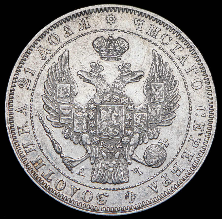 Аверс монеты 1 рубль 1843 года СПБ-АЧ орёл 1838, 8 звеньев