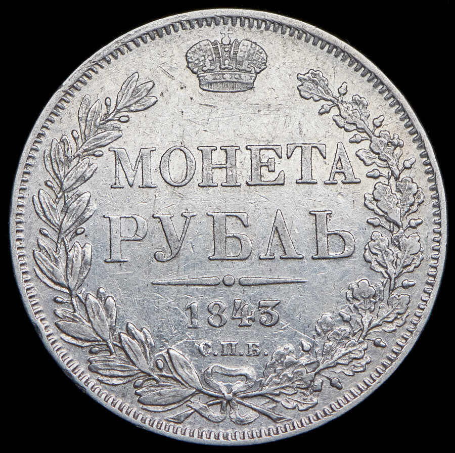 В центре указан номинал «МОНЕТА РУБЛЬ» в две строки. Над номиналом – Корона Российской империи. Под номиналом расположен декоративный разделитель в виде двух разнонаправленных фигурных линий и небольшой окружности между ними, в центре которой, выпуклая точка. Под разделителем — дата выпуска монеты «1843». Под цифрой даты — обозначение монетного двора «С.П.Б.». Вдоль канта, не доходя до короны, изображен венок из лавровой и дубовой ветви, которые в нижней части перевязаны лентой на узел бантом. По окружности канта имеются рельефные элементы, выполненные в виде зубцов.