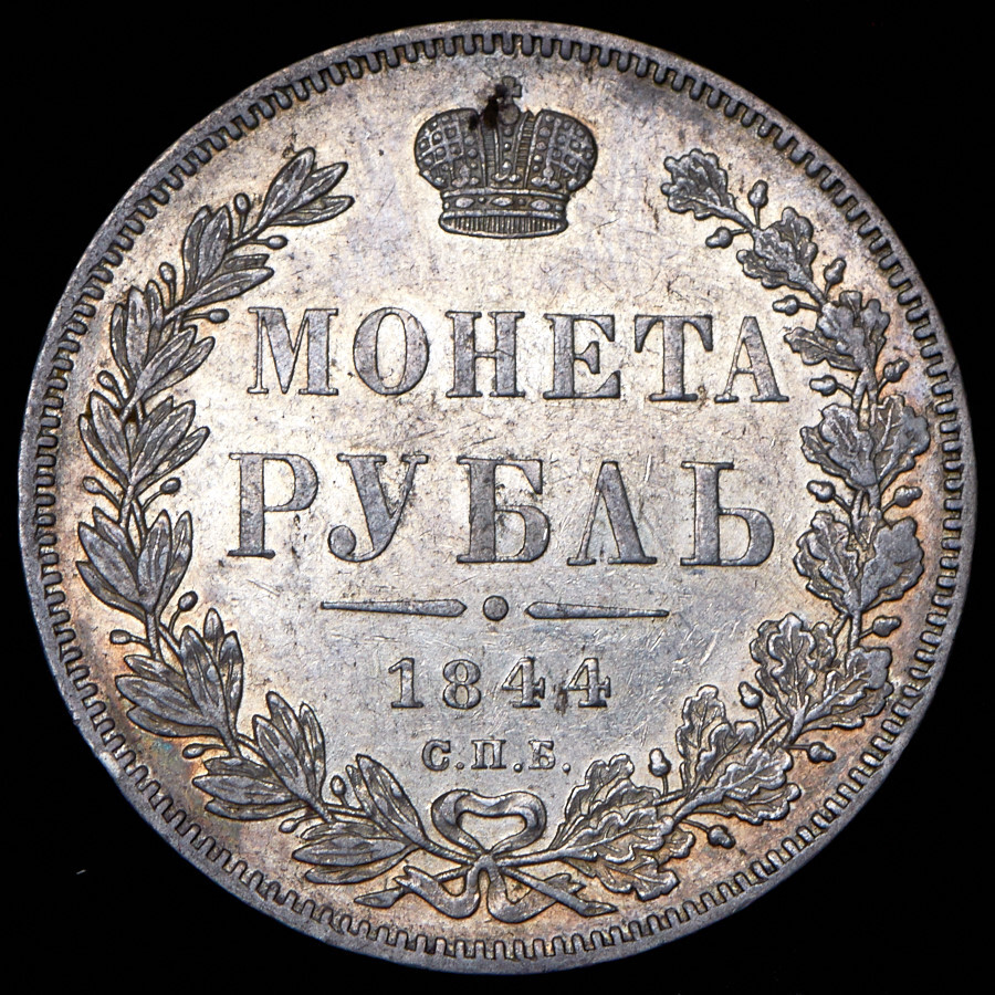 В центре указан номинал «МОНЕТА РУБЛЬ» в две строки. Над номиналом – Корона Российской империи. Под номиналом расположен декоративный разделитель в виде двух разнонаправленных фигурных линий и небольшой окружности между ними, в центре которой, выпуклая точка. Под разделителем — дата выпуска монеты «1844». Под цифрой даты — обозначение монетного двора «С.П.Б.». Вдоль канта, не доходя до короны, изображен венок из лавровой и дубовой ветви, которые в нижней части перевязаны лентой на узел бантом. По окружности канта имеются рельефные элементы, выполненные в виде зубцов.