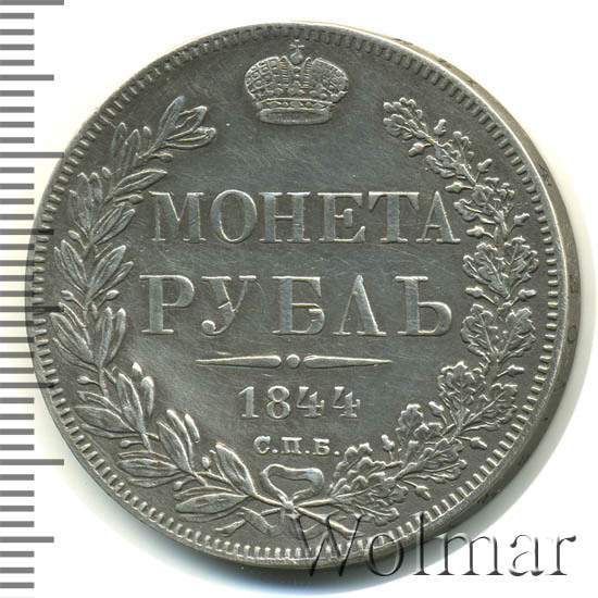В центре указан номинал «МОНЕТА РУБЛЬ» в две строки. Над номиналом – Корона Российской империи. Под номиналом расположен декоративный разделитель в виде двух разнонаправленных фигурных линий и небольшой окружности между ними, в центре которой, выпуклая точка. Под разделителем — дата выпуска монеты «1844». Под цифрой даты — обозначение монетного двора «С.П.Б.». Вдоль канта, не доходя до короны, изображен венок из лавровой и дубовой ветви, которые в нижней части перевязаны лентой на узел бантом. По окружности канта имеются рельефные элементы, выполненные в виде зубцов.
