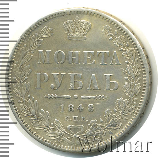 В центре указан номинал «МОНЕТА РУБЛЬ» в две строки. Над номиналом – Корона Российской империи. Под номиналом расположен декоративный разделитель в виде двух разнонаправленных фигурных линий и небольшой выпуклой точки между ними. Под разделителем — дата выпуска монеты «1848». Под цифрой даты — обозначение монетного двора «С.П.Б.». Вдоль канта, не доходя до короны, изображен венок из лавровой и дубовой ветви, которые в нижней части перевязаны лентой на узел бантом. По окружности канта имеются рельефные элементы, выполненные в виде зубцов.