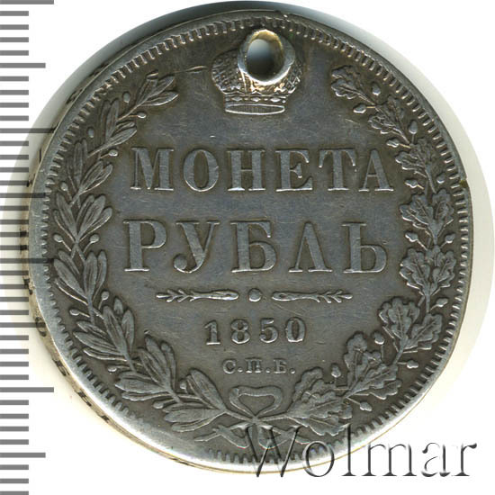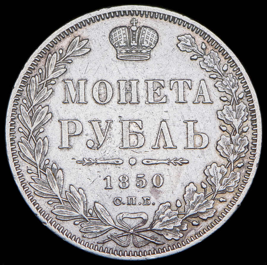 В центре указан номинал «МОНЕТА РУБЛЬ» в две строки. Над номиналом – Корона Российской империи. Под номиналом расположен декоративный разделитель в виде двух разнонаправленных фигурных линий и небольшой выпуклой точки между ними. Под разделителем — дата выпуска монеты «1850». Под цифрой даты — обозначение монетного двора «С.П.Б.». Вдоль канта, не доходя до короны, изображен венок из лавровой и дубовой ветви, которые в нижней части перевязаны лентой на узел бантом. По окружности канта имеются рельефные элементы, выполненные в виде зубцов.