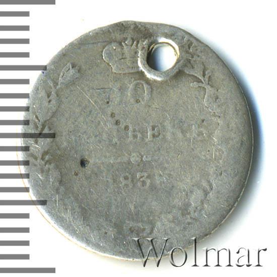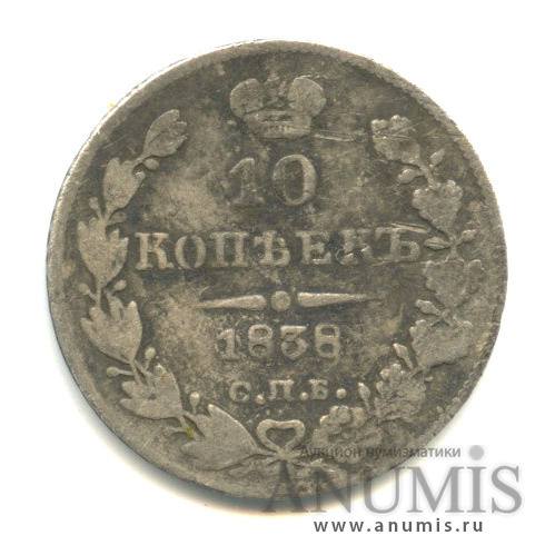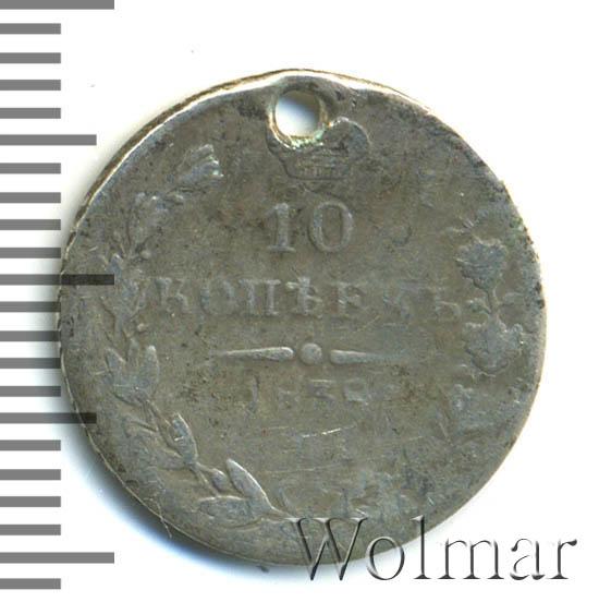 В центре указан номинал - «10». Над цифрой – Корона Российской империи. Под цифрой номинала — слово "КОПЕЕК". Ниже, расположен декоративный разделитель в виде двух разнонаправленных фигурных линий и небольшой окружности между ними, в центре которой, выпуклая точка. Под разделителем — дата выпуска монеты «1838». Под цифрой даты — обозначение монетного двора «С.П.Б.». Вдоль канта, не доходя до короны, изображен венок из лавровой и дубовой ветви, которые в нижней части перевязаны лентой на узел бантом. По окружности канта имеются рельефные элементы, выполненные в виде зубцов.