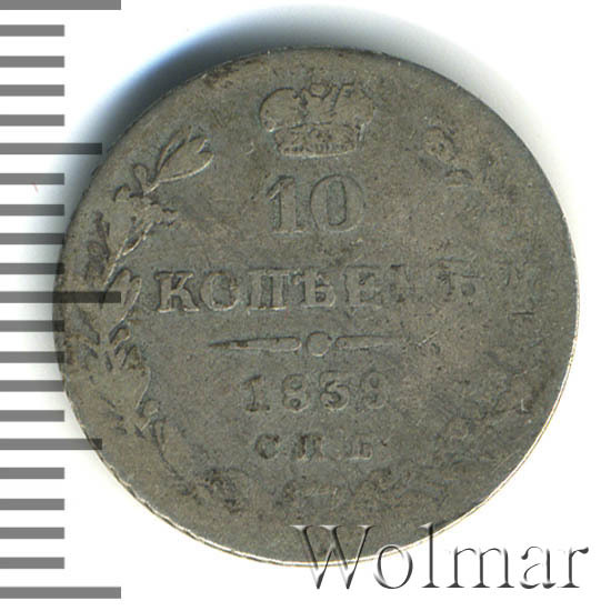 В центре указан номинал «10». Над цифрой – Корона Российской империи. Под цифрой номинала — слово "КОПЕЕК". Ниже, расположен декоративный разделитель в виде двух разнонаправленных фигурных линий и небольшой окружности между ними, в центре которой, выпуклая точка. Под разделителем — дата выпуска монеты «1839». Под цифрой даты — обозначение монетного двора «С.П.Б.». Вдоль канта, не доходя до короны, изображен венок из лавровой и дубовой ветви, которые в нижней части перевязаны лентой на узел бантом. По окружности канта имеются рельефные элементы, выполненные в виде зубцов.