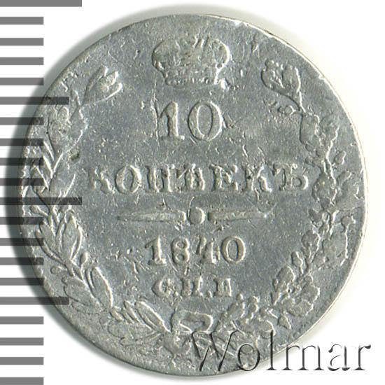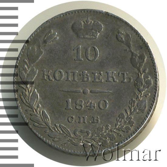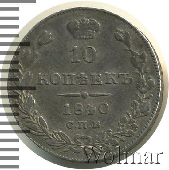 В центре указан номинал «10». Над цифрой – Корона Российской империи. Под цифрой номинала — слово "КОПЕЕК". Ниже, расположен декоративный разделитель в виде двух разнонаправленных фигурных линий и небольшой окружности между ними, в центре которой, выпуклая точка. Под разделителем — дата выпуска монеты «1840». Под цифрой даты — обозначение монетного двора «С.П.Б.». Вдоль канта, не доходя до короны, изображен венок из лавровой и дубовой ветви, которые в нижней части перевязаны лентой на узел бантом. По окружности канта имеются рельефные элементы, выполненные в виде зубцов.