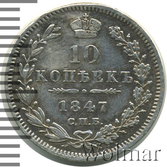 В центре указан номинал «10». Над цифрой – Корона Российской империи. Под цифрой номинала — слово "КОПЕЕК". Ниже, расположен декоративный разделитель в виде двух разнонаправленных фигурных линий и небольшой выпуклой точки между ними. Под разделителем — дата выпуска монеты «1847». Под цифрой даты — обозначение монетного двора «С.П.Б.». Вдоль канта, не доходя до короны, изображен венок из лавровой и дубовой ветви, которые в нижней части перевязаны лентой на узел бантом. По окружности канта имеются рельефные элементы, выполненные в виде зубцов.