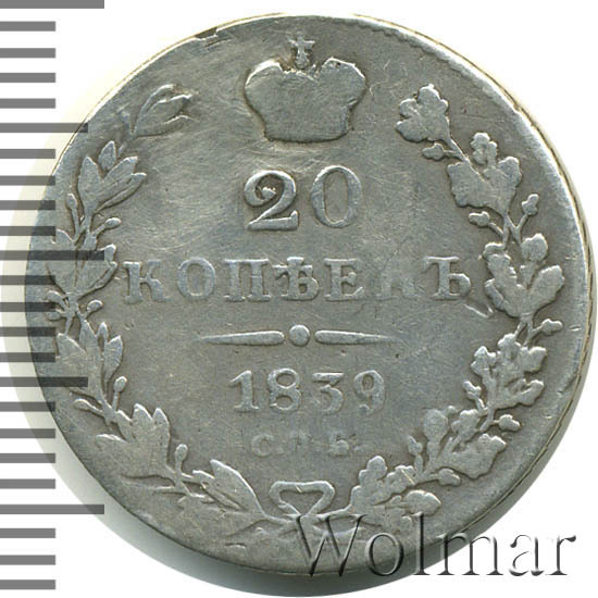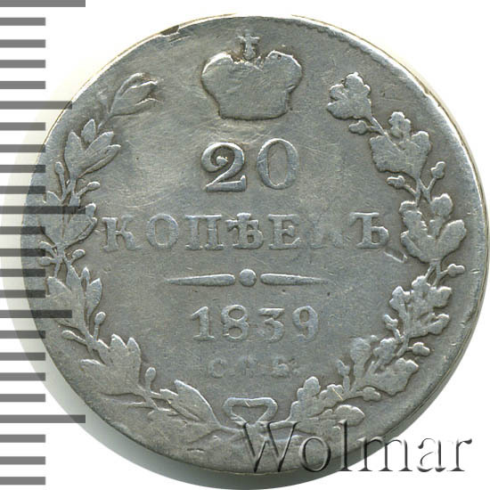 В центре указан номинал «20». Над цифрой – Корона Российской империи. Под цифрой номинала — слово "КОПЕЕК". Ниже, расположен декоративный разделитель в виде двух разнонаправленных фигурных линий и небольшой окружности между ними, в центре которой, выпуклая точка. Под разделителем — дата выпуска монеты «1839». Под цифрой даты — обозначение монетного двора «С.П.Б.». Вдоль канта, не доходя до короны, изображен венок из лавровой и дубовой ветви, которые в нижней части перевязаны лентой на узел бантом. По окружности канта имеются рельефные элементы, выполненные в виде зубцов.