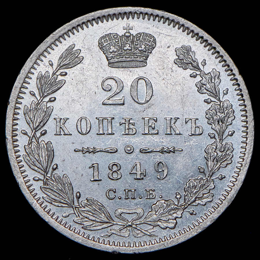 В центре указан номинал «20». Над цифрой – Корона Российской империи. Под цифрой номинала — слово "КОПЕЕК". Ниже, расположен декоративный разделитель в виде двух разнонаправленных фигурных линий и небольшой окружности между ними, в центре которой, выпуклая точка. Под разделителем — дата выпуска монеты «1849». Под цифрой даты — обозначение монетного двора «С.П.Б.». Вдоль канта, не доходя до короны, изображен венок из лавровой и дубовой ветви, которые в нижней части перевязаны лентой на узел бантом. По окружности канта имеются рельефные элементы, выполненные в виде зубцов.